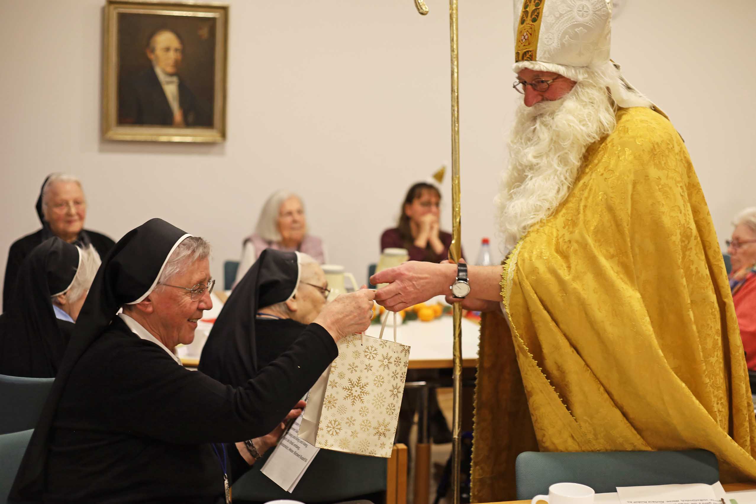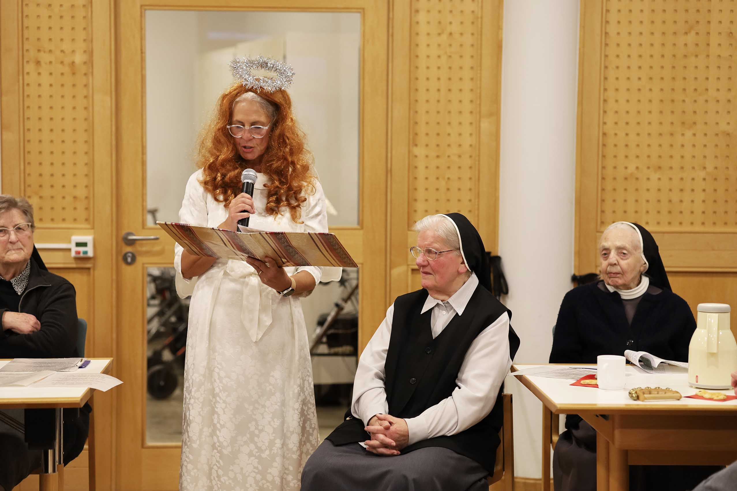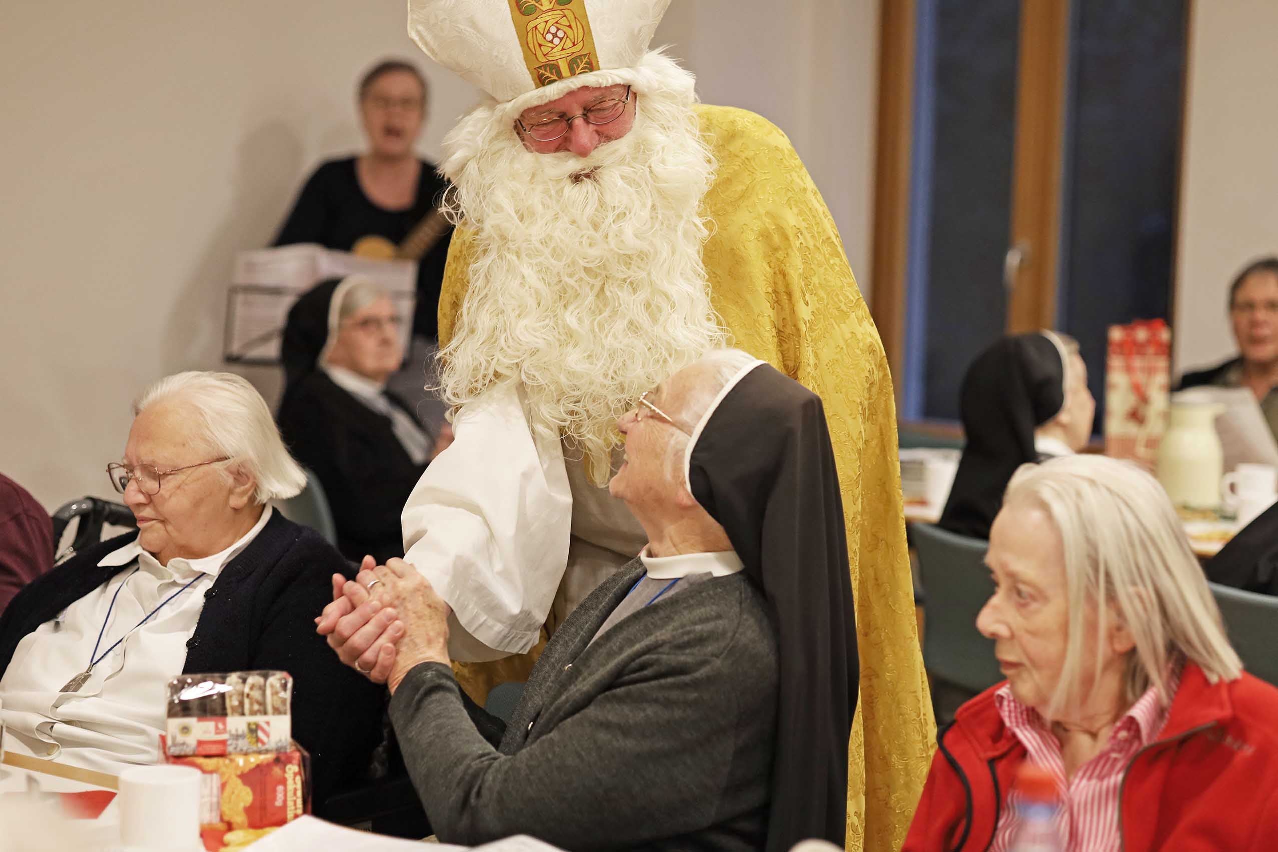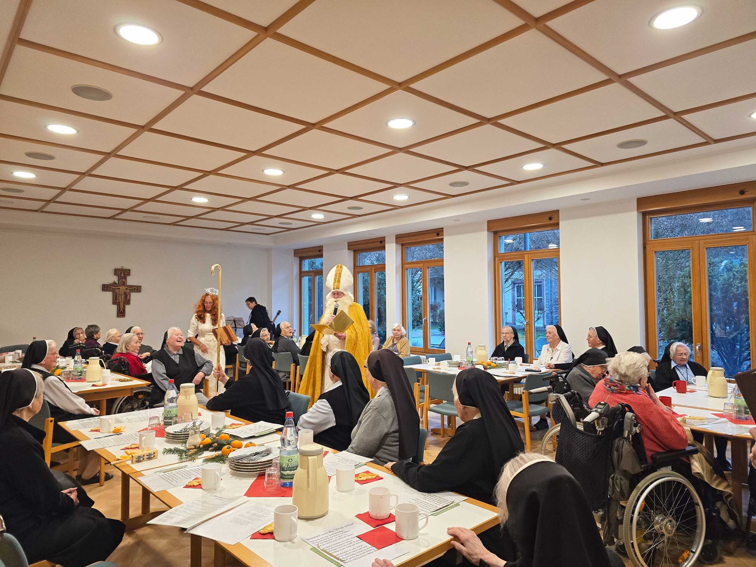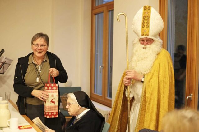 Der heilige Nikolaus kommt auch ins Oberzeller Pflegeheim. Im festlich dekorierten Saal warten die Bewohnerinnen gemeinsam auf den Besuch und vertreiben sich die Wartezeit mit Liedern. Nachdem auch die Geschichte des Bischofs erzählt wurde, tritt der Nikolaus durch die Tür, verteilt kleine Geschenke und erfüllt den Raum mit herzlicher Wärme. Der Engel, der ihn begleitet, trägt für jede Bewohnerin ein persönlich gereimtes Gedicht vor – ein berührender Moment, der oft ein dankbares Lächeln in die Gesichter zaubert. Mit einem gemeinsamen Abendessen klingt der Nikolaustag festlich aus.