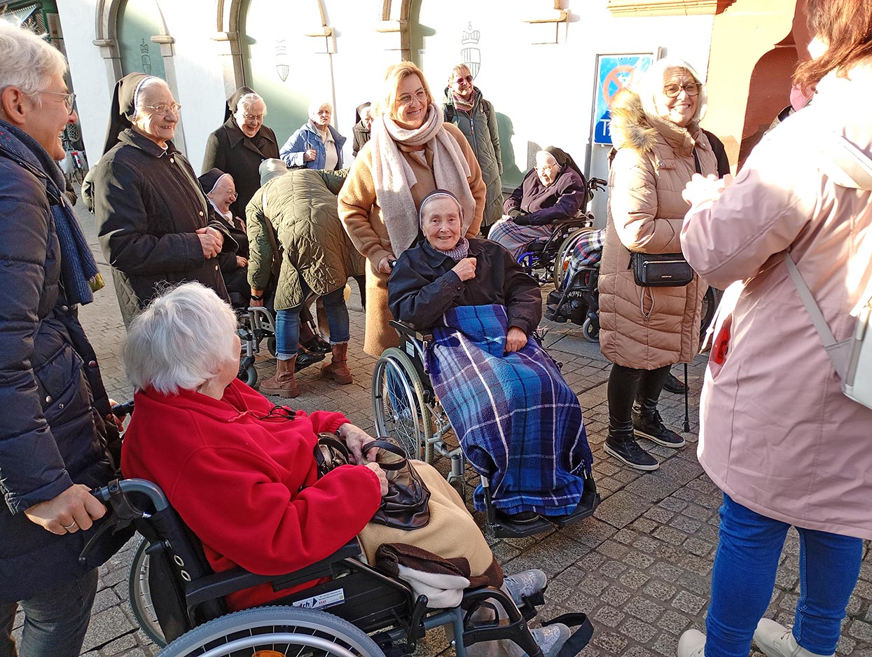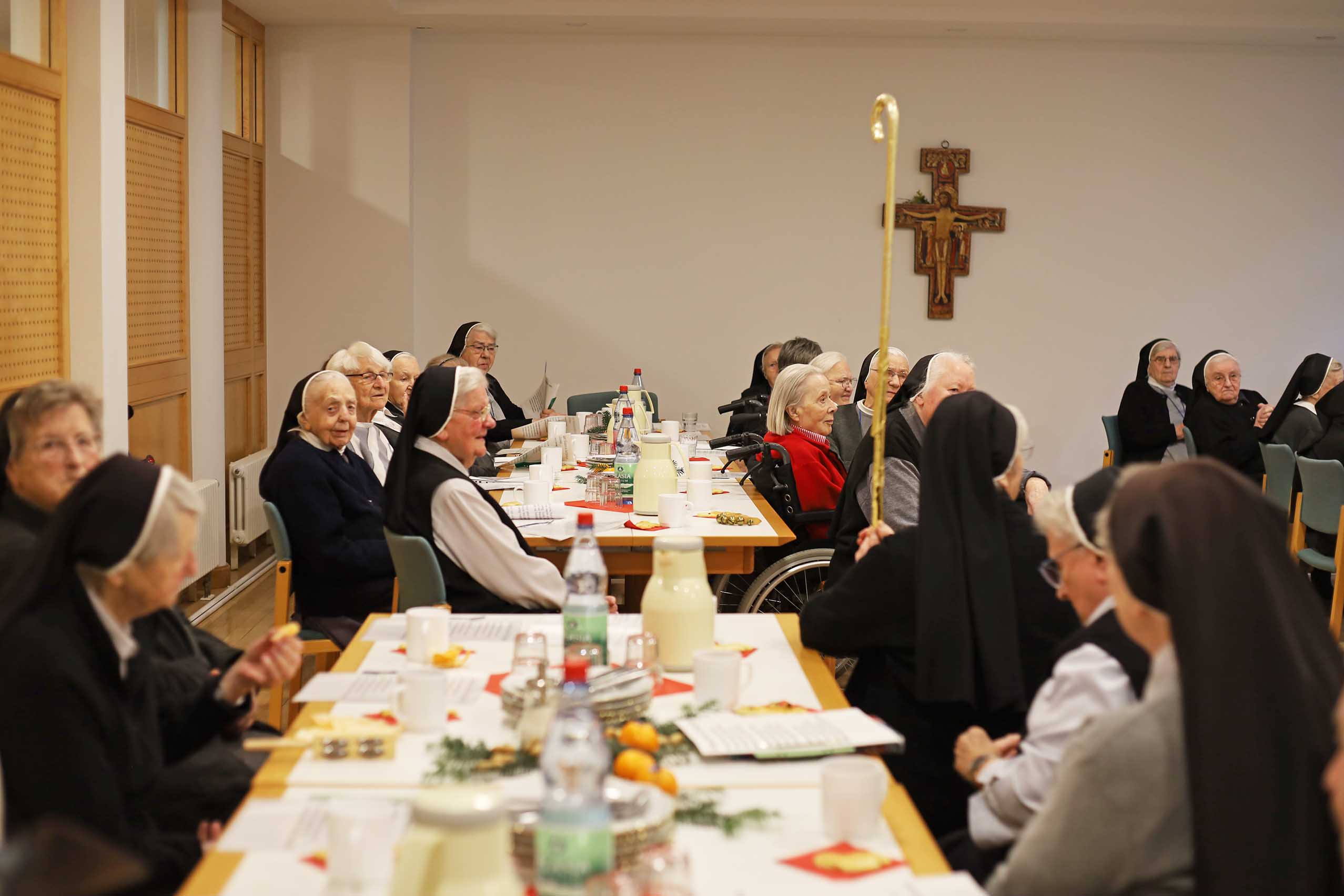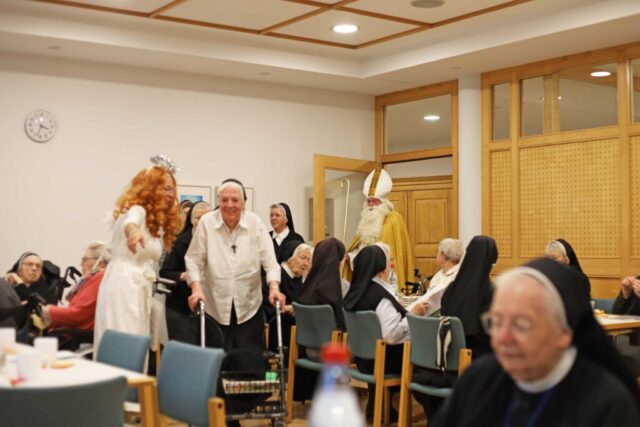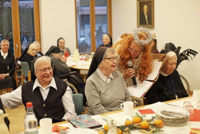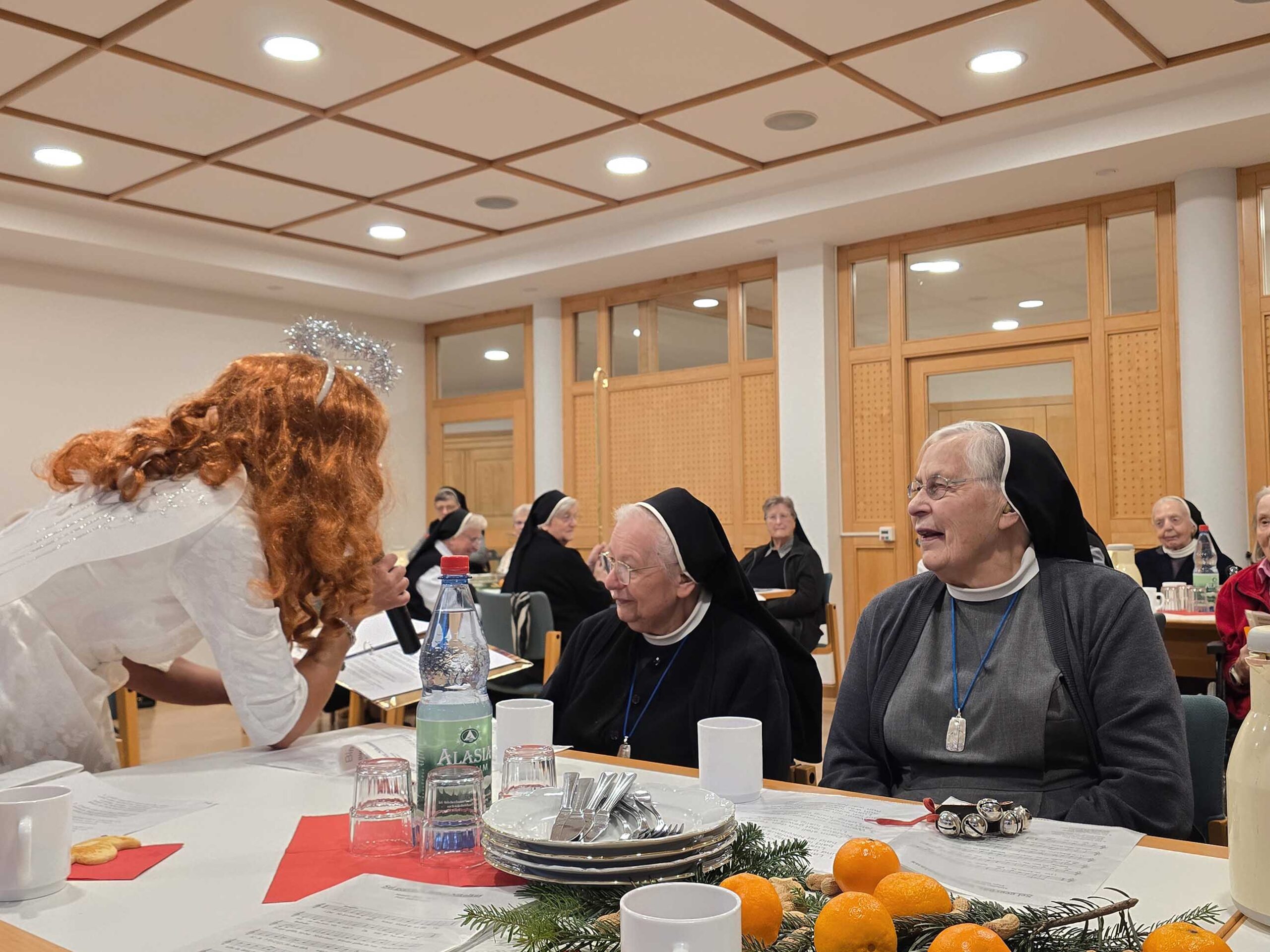 Der heilige Nikolaus kommt auch ins Oberzeller Pflegeheim. Im festlich dekorierten Saal warten die Bewohnerinnen gemeinsam auf den Besuch und vertreiben sich die Wartezeit mit Liedern. Nachdem auch die Geschichte des Bischofs erzählt wurde, tritt der Nikolaus durch die Tür, verteilt kleine Geschenke und erfüllt den Raum mit herzlicher Wärme. Der Engel, der ihn begleitet, trägt für jede Bewohnerin ein persönlich gereimtes Gedicht vor – ein berührender Moment, der oft ein dankbares Lächeln in die Gesichter zaubert. Mit einem gemeinsamen Abendessen klingt der Nikolaustag festlich aus.