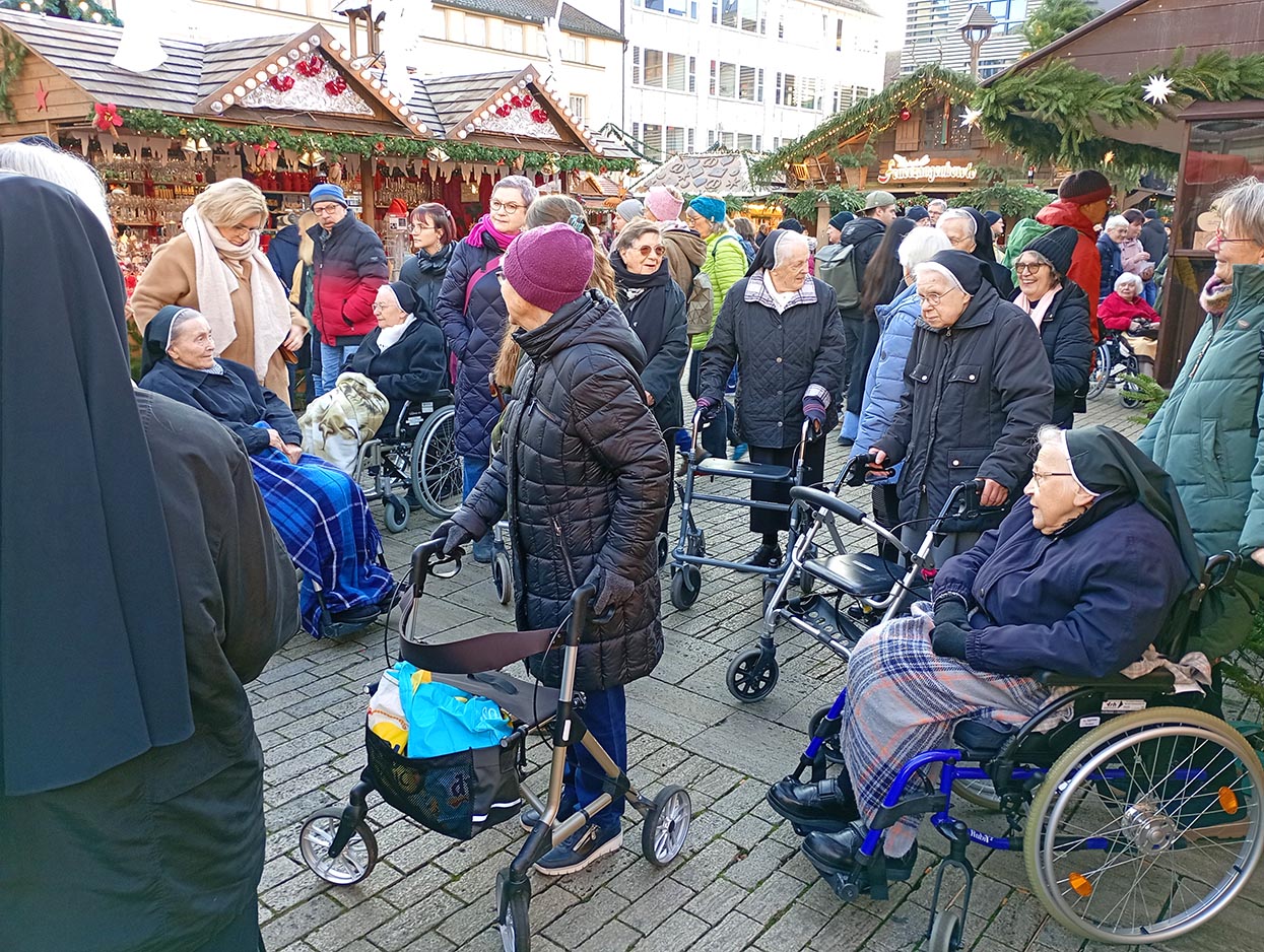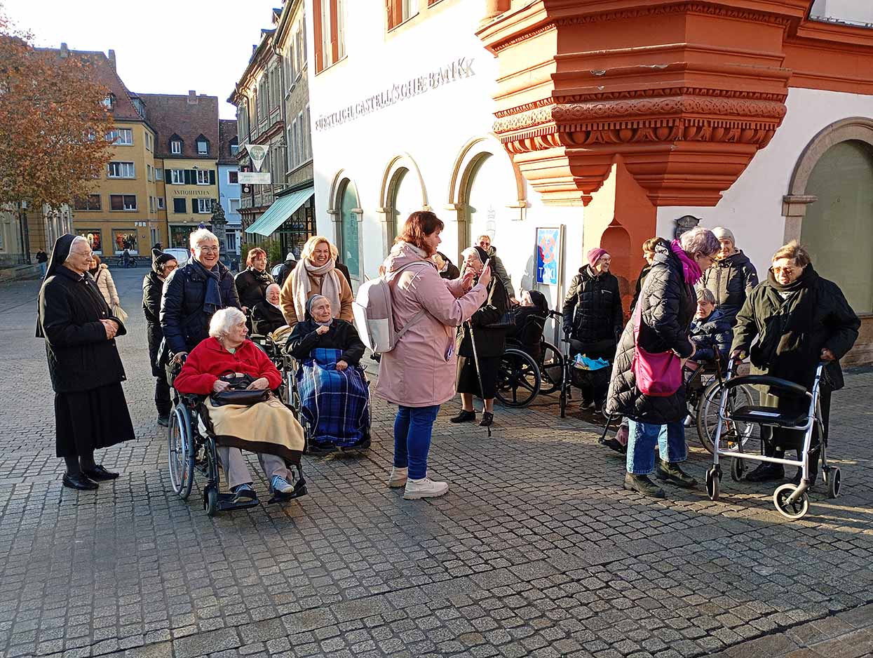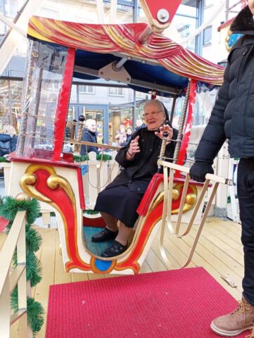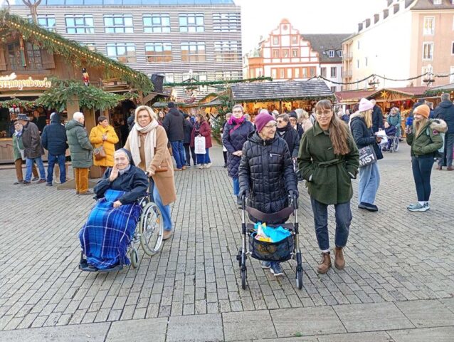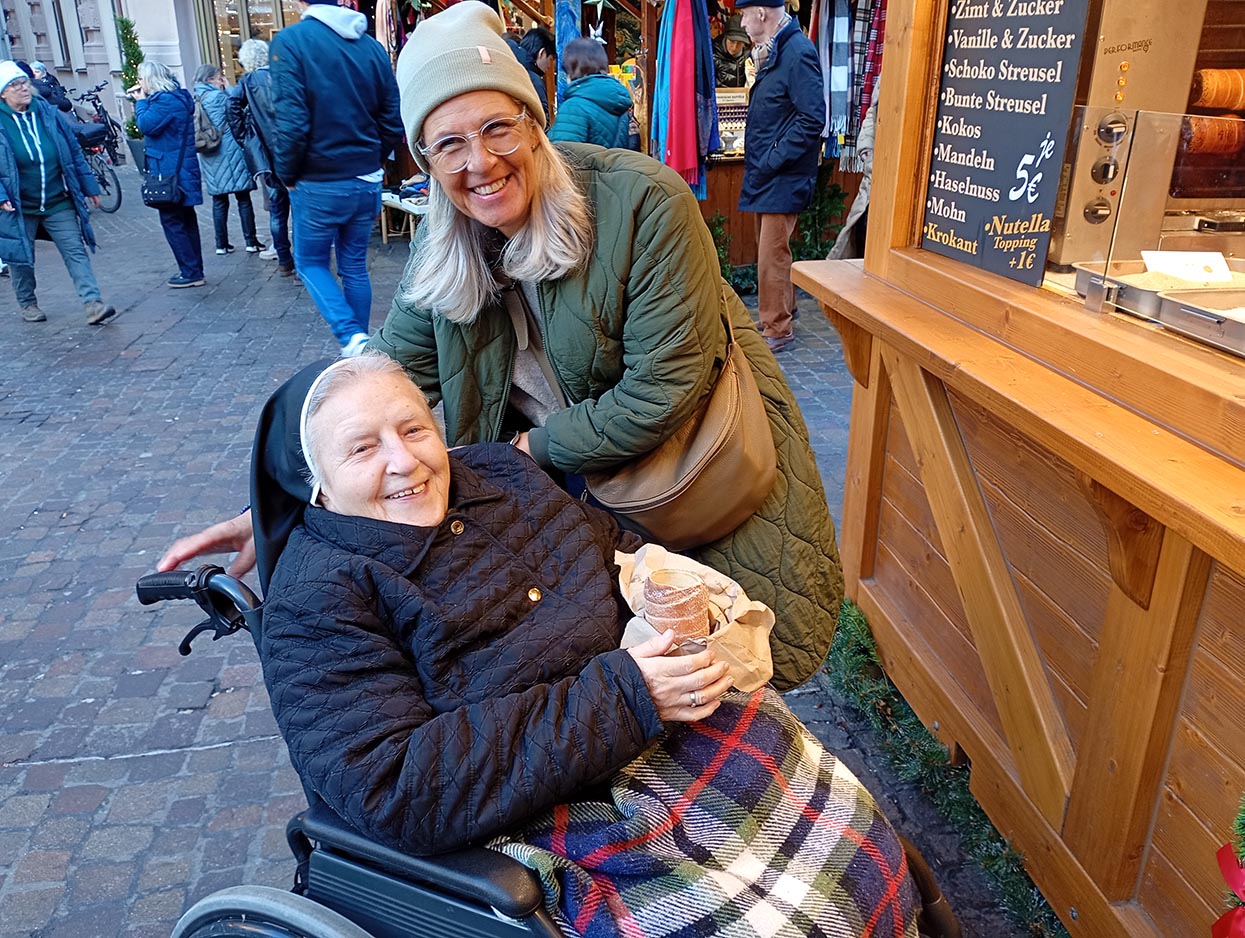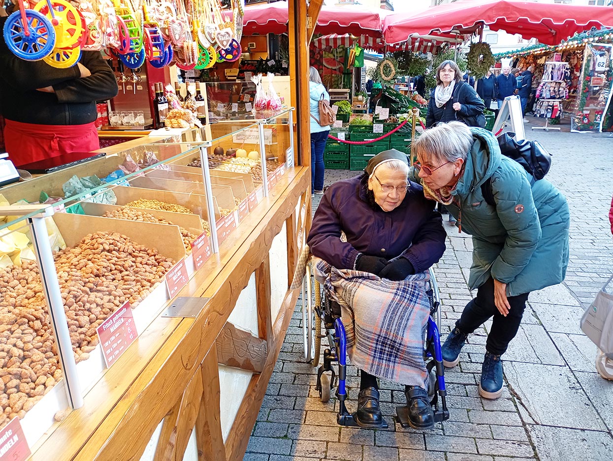 Absolutes Highlight war dieses Jahr der Ausflug auf den Würzburger Weihnachtsmarkt in der Stadt: Mit Unterstützung des Arbeiter-Samariter-Bundes begleitete das Antoniushaus-Team eine kleine Gruppe der Bewohnerinnen. Die Eins-zu-eins-Betreuung ermöglichte es den Frauen, die besondere Stimmung in der Würzburger Innenstadt zu genießen. Es war genug Zeit kleine Geschenke zu kaufen und Leckereien an den Ständen zu probieren. Die Fahrt mit der Gondel war für die Mobilen unter den Bewohnerinnen ein wunderschönes Erlebnis!