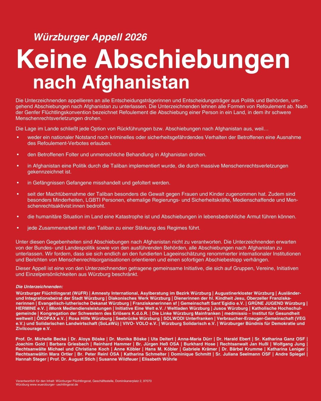 Mit unserer Unterschrift schließen wir uns der klaren Forderung an, Abschiebungen nach Afghanistan zu unterlassen und politische Entscheidungen an den fundierten Lageeinschätzungen internationaler Institutionen und Menschenrechtsorganisationen auszurichten.