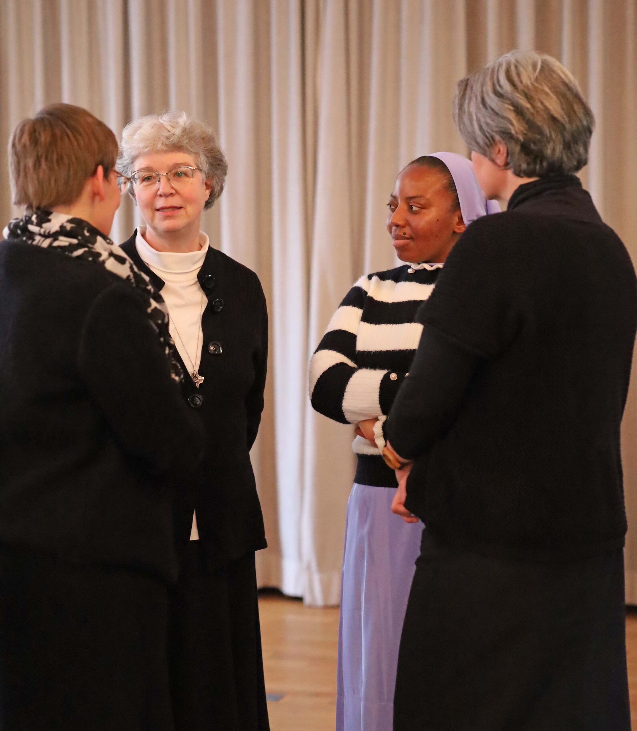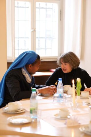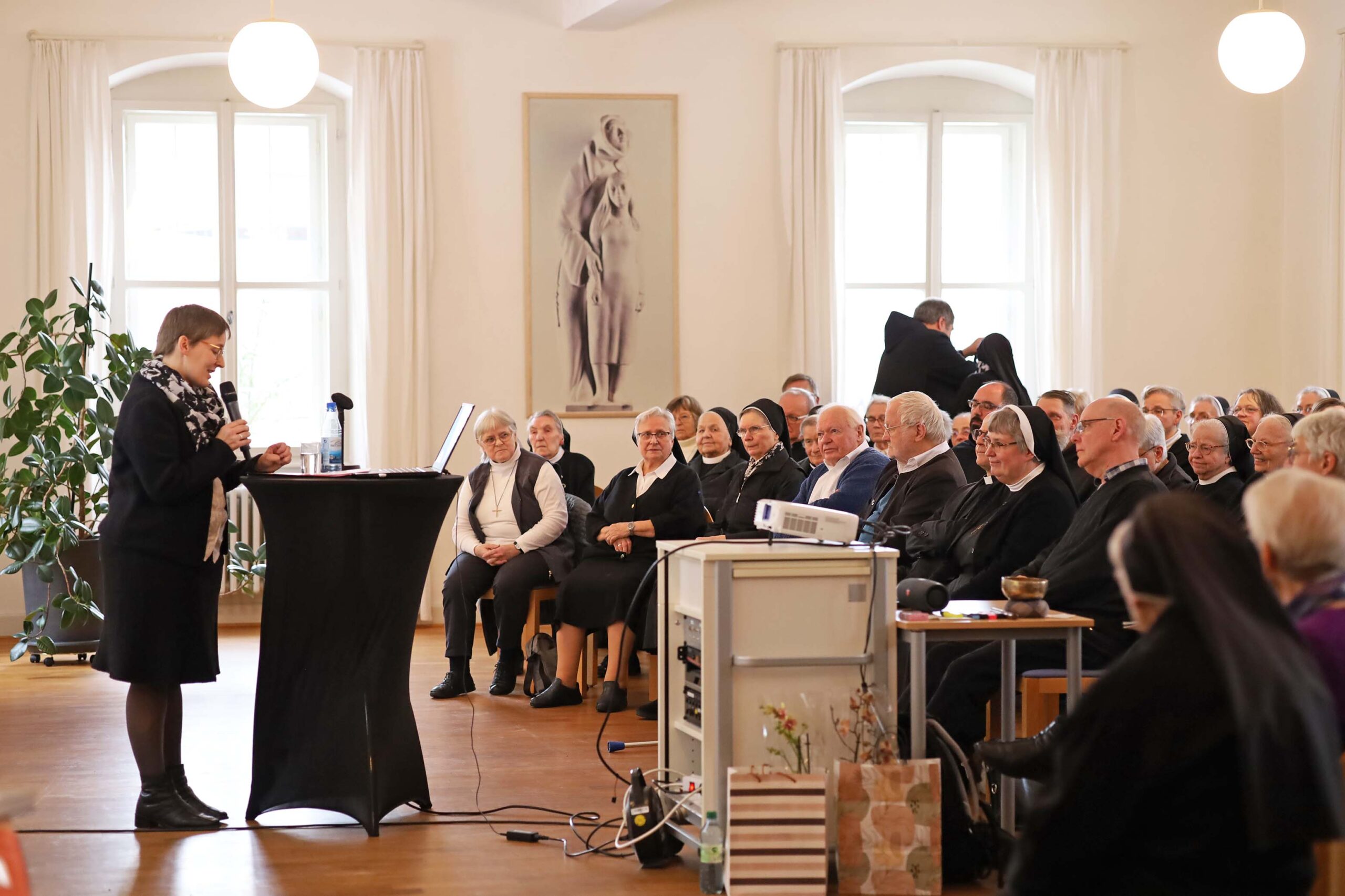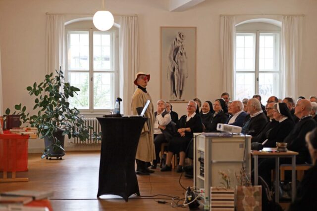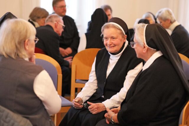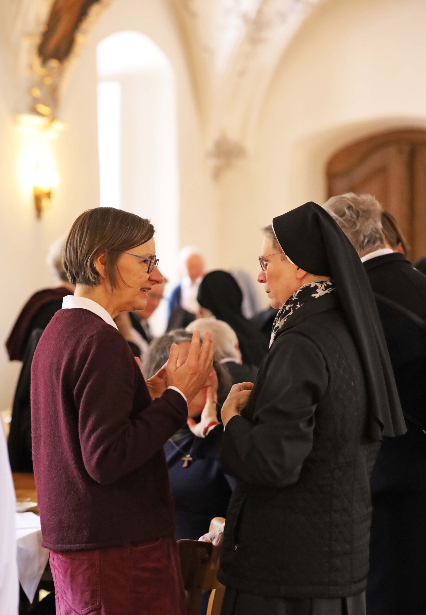 Nach anregenden Gesprächen bei Kaffee und Kuchen in den Oberzeller Refektorien folgte ein Vortrag von Sr. Dr. Katharina Ganz. Unter dem Leitwort „Geh in meinen Spuren, bis sie ganz die deinen sind“ stellte die frühere Generaloberin der Oberzeller Franziskanerinnen den heiligen Franziskus ins Zentrum, dessen 800. Todestag in diesem Jahr begangen wird. Sie beschrieb ihn als „gottvernarrt, armutsverliebt und gemeinschaftserprobt“ und zeigte in eindrücklichen Bildern, wie Franziskus’ radikale Umkehr und sein Vertrauen auf Gottes Führung zu einem befreiten, solidarischen Leben führten. Armut verstand er dabei nicht als Mangel, sondern als Einladung zu Freiheit und Geschwisterlichkeit. In Kleingruppen wurde das Thema anschließend im „Gespräch im Geiste“ vertieft – eine Methode geistlicher Unterscheidung, die auf gegenseitigem Hören beruht.
