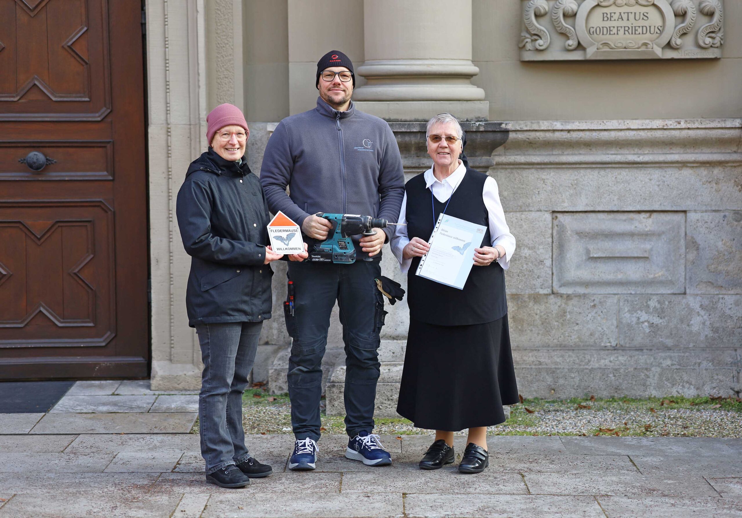 Fledermausberaterin Claudia Bolte mit Plakette, Alexander Gittel, Vorarbeiter des Handwerker-Teams und Sr. Margot Schmitt mit Urkunde.